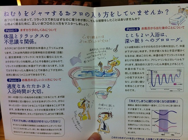 ゆったりと20分~30分つかることで芯から暖まることが出来ます。お湯が熱すぎると、身体の緊張状態をつくる副交感神経が刺激され、かえって目がさえてしまうので要注意です!!