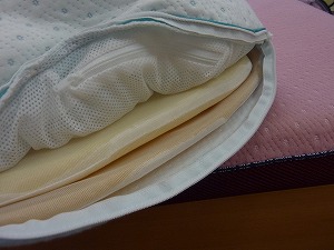 こちらは上から3段目の「やや柔らかめ」の枕。5mmと1cmのウレタン、そしてメッシュの中にはパイプが入っているので、自分の高さに合わせて抜くことができます。