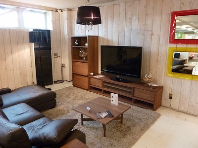 写真をたくさんとってきてくれたのですが、ショールームの素晴らしさが伝わってきます。壁にも“ブラックウォールナット”の集成材が使われていたり、ダイニングセットやTVボードにも品の良さを感じられました( ^^) _~~