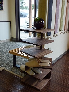 睡眠屋の玄関にスリッパ置きとして活躍している、アカセ木工さんの“シェルフ”が!!