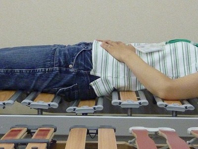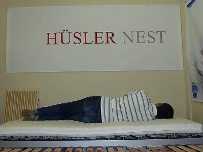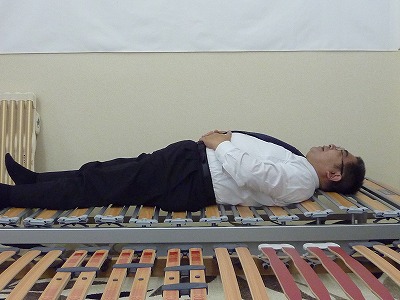 『ウッドスプリング』に天然素材ゴムでできた『ラッテクスマット』をのせ、社長自らがモデルに! 横向きの“寝姿勢”がキレイです!まっすぐです!奇麗な沈み込み!