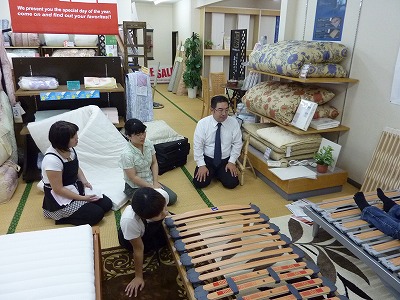 スタッフみんなで寝試し&勉強会です。 スプリング1本で約130kgまで耐えられます。『ウッドスプリング』を骨と考えその上に乗せた布団を筋肉と考えると、その上に眠ることは130kg以上のかたでも大丈夫です。ただ、ベッドの上でお子さんが飛び跳ねるのは・・・残念ながら無理があるようです。