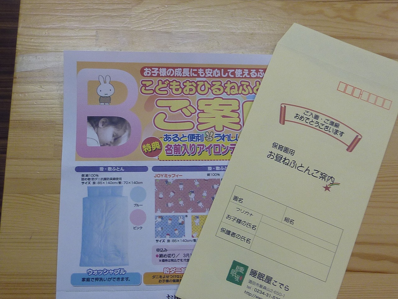 最近はお布団類も手軽にスーパー等でも手に入るようになり、どうしても柄や値段で選ばれてしまいがちです。お昼寝ふとんも例外ではありません。育ち盛りのお子さんのお昼寝ふとんも、ぜひしっかりした物を選んで欲しいなと、市内の各園さんにパンフレットをお配りしております。既製品ではなく、サイズや中身も希望によっては変更も可能ですので、ご相談される事もあります。