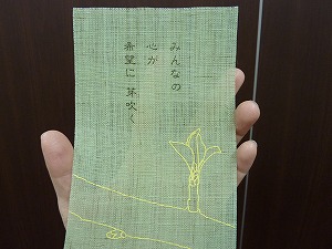 震災からの復興への願いを込め、新芽をモチーフに麻生地を染め上げた布絵でした。