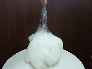 綿には引っ張ったときに短くきれてしまう綿と、写真のように長く伸びる綿があります。特に長く伸びる綿を「超長綿」と言い、超長綿は「繊維の宝石」と呼ばれる程、光沢があり、柔らかいのです。そんな魅惑の綿で作られた肌掛け布団が睡眠屋に登場しました。