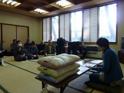 前回は睡眠に悩みや興味のある方対象の女性でしたので、少し深い話をさせて頂きました。ですが今回は男性も多く、”睡眠”という難しいテーマではなく、とにかくまくらについて知りたいとの要望が事前にありました。さらには話だけではわからないので、実際にまくらを見たり試したりもしたいとの声が多かったので、会場も畳のお部屋に変えて頂き、ふとんとまくら持参で出かけました。