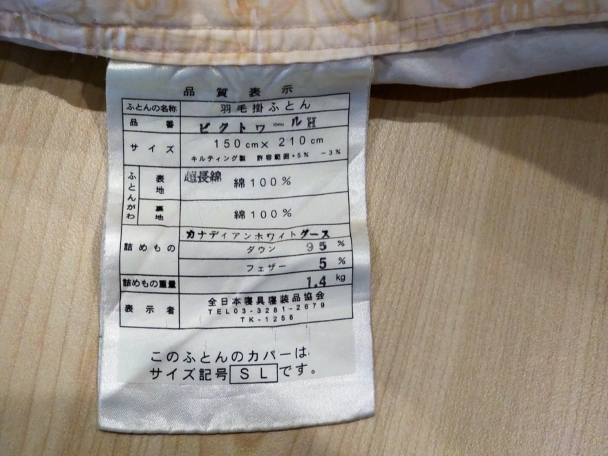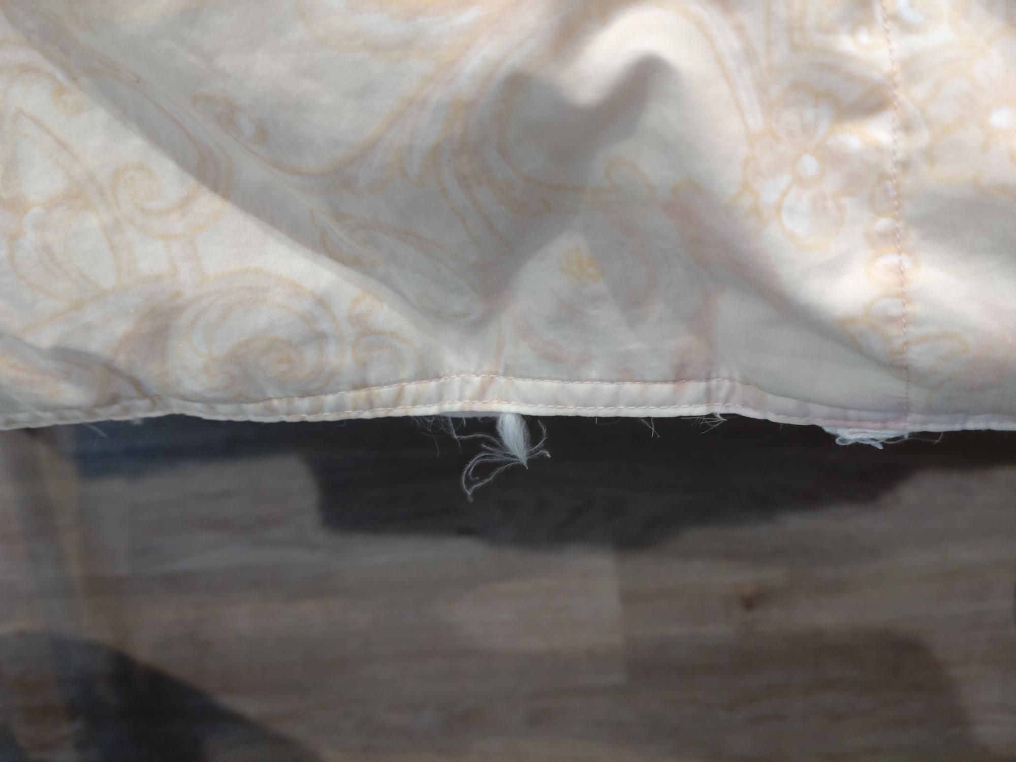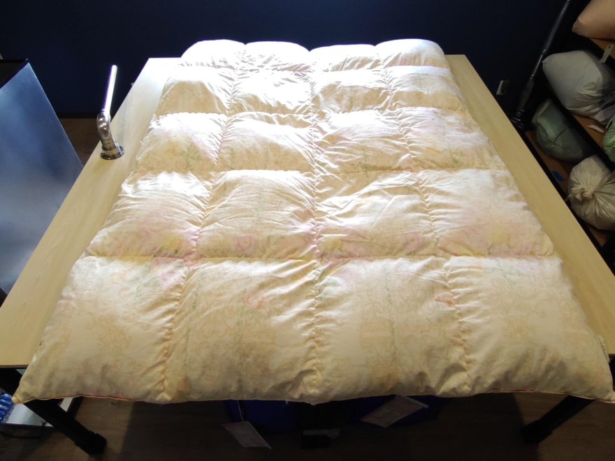 羽毛が吹き出しを見つけられたことをきっかけに、当店へ羽毛布団リフォームのご依頼をいただきました。お手持ちの他の羽毛布団と比べると羽毛の充填量が多く、重さも気になっていたとのことでしたので、この機会に軽めの仕様でお作りすることとなりました。