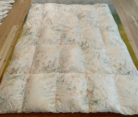 ご婚礼時から大切に使われてきた羽毛布団の生地が破れ、羽毛の吹き出しが見られるようになってきたとご相談いただきました。品質の良い羽毛布団なので、次の代にも受け継いでもらいたいというご希望も伺い、また長く安心してお使いいただけるよう相談を重ねながらリフォームを進めました。