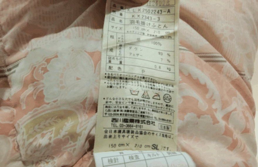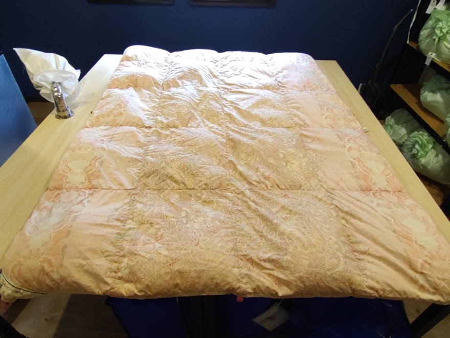 シングル2枚合わせからセミダブル合掛けへとサイズアップするリフォームでしたが、予想以上に羽毛が残り補充羽毛なしでお作りいただけました。2枚合わせの肌掛けはへたりが心配な状態でしたが、日々丁寧にお使いになっていたことと、まめにお手入れをされていたことが、羽毛の損傷が進んでいなかった結果になったのだと思います。