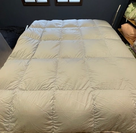 「しっかりとした品質の羽毛布団なので、しっかりとしたお店にお願いをしたい」と、当店のホームページをご覧になり、有難いことにお声掛けくださったそうです。サイズ変更に対応していることも、決め手の一つになったと伺いました。羽毛布団リフォームという貴重な機会ですので、お客様の「こういう羽毛布団があったらな」のお気持ちを大切に伺い、セミダブルのロング丈230㎝でお仕立ていたしました。