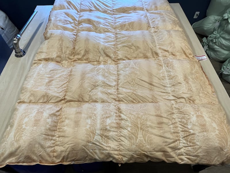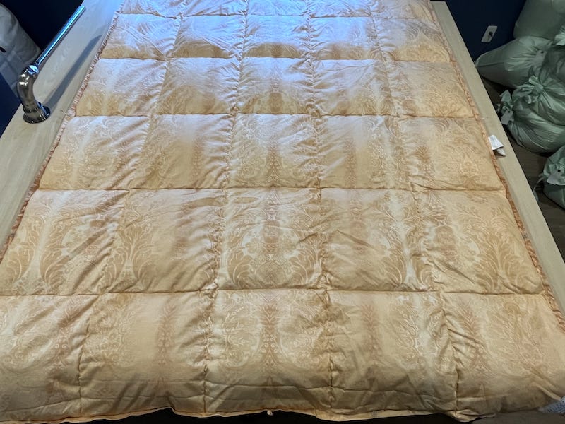 羽毛布団の淵に12箇所ボタン留めがある「2枚合わせ仕様の羽毛布団を1枚にしたい」というご依頼を多くいただきます。2枚合わせた厚さの「本掛け」するか、厚い方に合わせた「合掛け」にするか、ご希望を伺いながらお作りしています。今回は1枚でも暖かい仕様にしたいとのことでしたので、「本掛け」でお作りしました。2枚合わせの羽毛布団は、季節に応じて暖かさを調整できる便利な仕様ですが、「重ねたり外したりが面倒」だったりもします。実際に使ってみて、ご自身の暮らしに合わせてお作りいただけることも、リフォームならではよ良さだと思います。